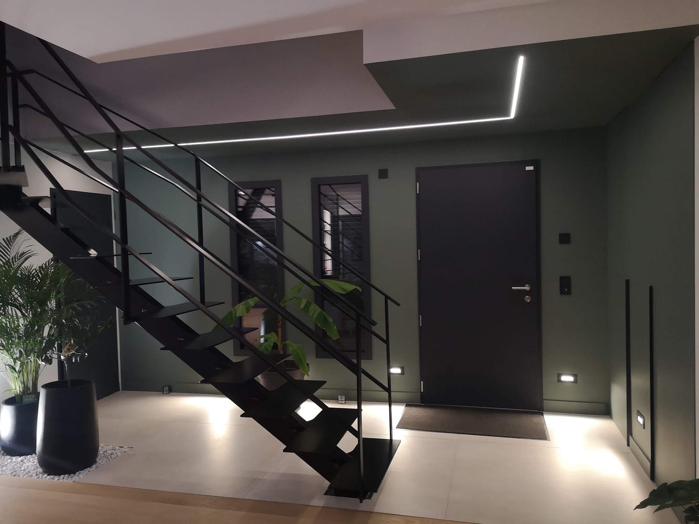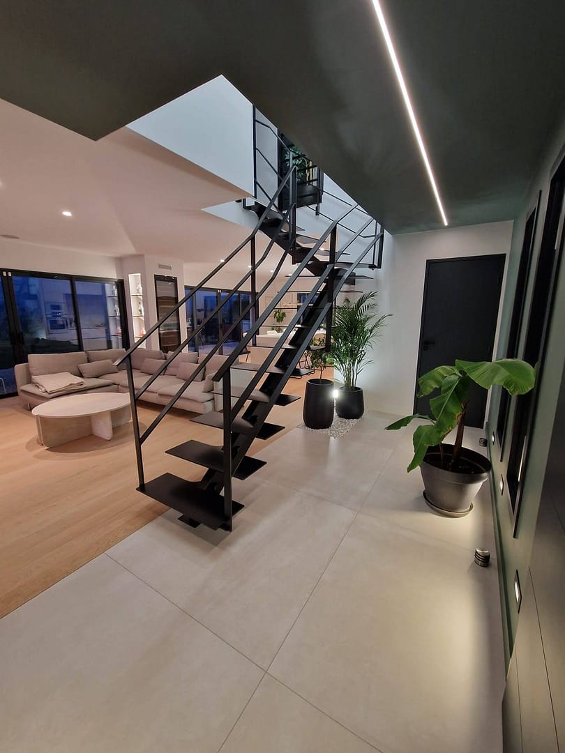 Des réglettes LED encastrées à l’entrée ainsi que sur l’espace cave à vin, puis des spots en bas de mur, ajoutent un éclairage moderne et discret.