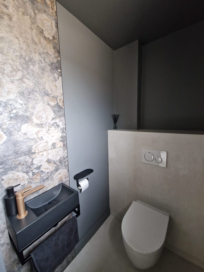 Avec l’aide de mes partenaires, une pose de carrelage grand format à l’entrée, se prolongeant dans les toilettes, a été réalisée. L’intégration d’une frise en faïence pour l’espace lave-mains a également été créée.